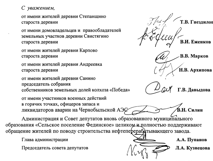 Мы отлично понимаем, что очень удобно и с меньшими затратами построить завод рядом с автотрассой «Урал», железнодорожной веткой и нефтепроводом из Татарстана. Неважно, что в непосредственной близости находятся пять деревень, жители которых категорически возражают против строительства НПЗ в этом месте.